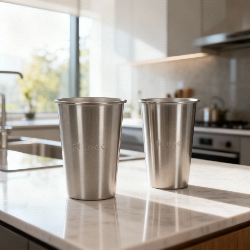 Stainless steel cups with logo Stainless steel drinking cups in various sizes and colors, engraved with your logo. Details